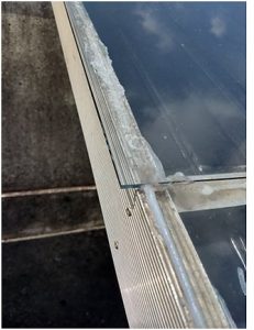 1. Vidro preso com parafuso e silicone – totalmente incorreto.