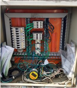 O quadro de comando responsável pela automatização do sistema – como ligar e desligar as bombas e resistências. Este quadro está totalmente fora das normas técnicas, com fios expostos e alta possibilidade de ocorrer um curto circuito e consequentemente incêndio já que as fiações estão interligadas: